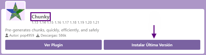 - Busca en la lista el plugin llamado Chunky y le das en el botón Instalar Última Versión y automáticamente se instala en tu servidor.